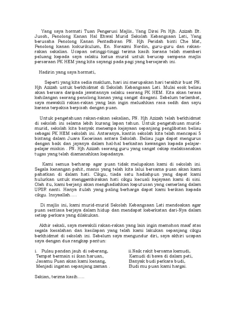 Contoh teks pengacara majlis / ucapan emcee majlis persaraan cikgu. Teks ucapan untuk majlis persaraan guru (appriciating and sent off) teks ucapan pengetua. Mengalu ngalukan ketibaan yang diraikan yg. Kita saksikan persembahan sajak dan multimedia sempena persaraan yang diraikan. Majlis seterusnya ingin menjemput dan mempersilakan wakil guru skc, pn sabariah bt jumri untuk menyampaikan ucapan. Majlis persaraan ketua jabatanfull description. Majlis seterusnya ingin menjemput dan mempersilakan wakil guru en. Teks ucapan majlis perpisahan persaraan. Ucapan sir lokman sempena majlis persaraan nya. Majlis persaraan guru besar en ramlan bin hussin gbramlan part 4 ucapan pk pentadbiran. Di semua peringkat organisasi pendidikan, termasuklah sekolah. Semoga persaraan ini akan membawa kebahagian. Video ucapan majlis perpisahan guru bertukar ke sekolah lain.