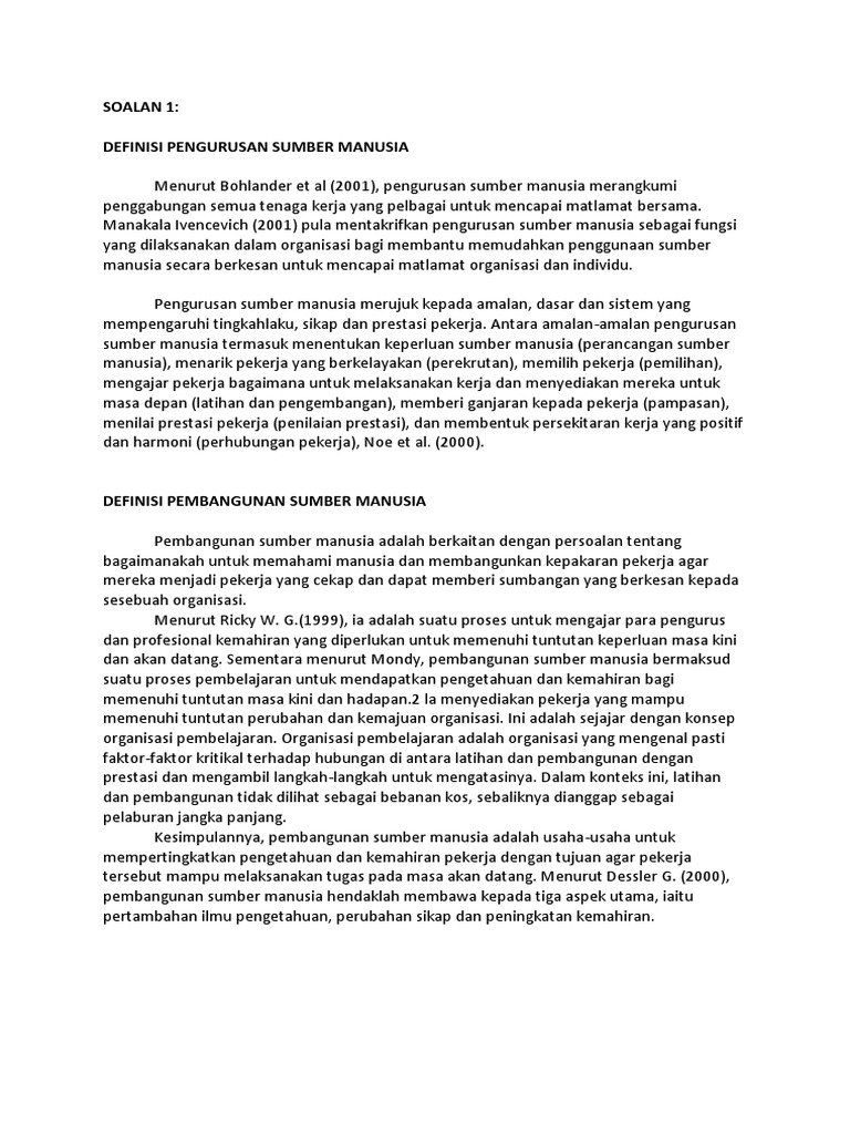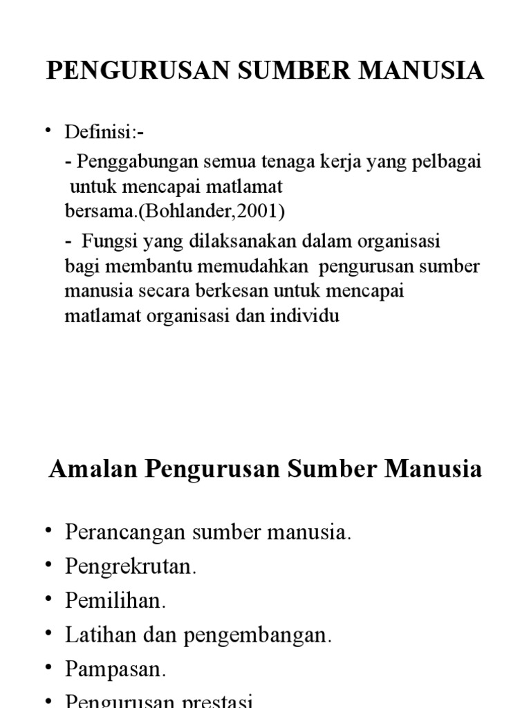 Definisi Pengurusan Sumber Manusia : Blqkdevfgm Ehm : Empat aktiviti pengurusan yang termasuk dalam definisi ini adalah:. Amalan pengurusan sumber manusia berteraskan kompetensi dan kualiti perkhidmatan dalam organisasi awam di malaysia: Pengurusan sumber manusia nur syakilawani bt abd samad nur amirah bt muhamad yusuff nur syazana bt bederi sham. Pengurusan sumber manusia sebagai pengurusan personalia yang memberi penekanan kepada kemahiran teknikal untuk penilaian, pemilihan, latihan dan sebagainya. 2.1 pengurusan sumber manusia dalam iks 14 2.1.1 definisi pengurusan sumber manusia (psm) 14 2.1.1.1 latihan dan pembangunan 16 2.1.1.2 pengambilan dan pemilihan pekerja 19 2.1.1.3 pampasan dan faedah 20 2.1.2 ama]an psm dalam iks 22 2.2 kepentingan pengurusan sumber manusia 24 2.2.1 pembangunan maksimum setiap pekerja 24 Menurut pendapat dari anwar prabu mangkunegara, sumber daya manusia (sdm) merupakan sebagai suatu perencanaan pengorganisasian, pelaksanaan, dan pengawasan terhadap pengadaan, pengembangan, pemberian balas jasa, pengintegrasian, pemeliharaan, dan pemisahan tenaga kerja dalam rangka mencapai tujuan organisasi.